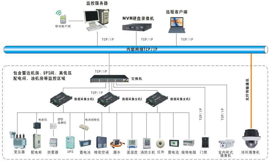 雷達站綜合監(jiān)控管理系統(tǒng)應(yīng)能實現(xiàn)對高壓配電柜、變壓器、低壓配電柜、柴油發(fā)電機、UPS、各類配電柜(箱)、直流電源、蓄電池組和配電機房工作環(huán)境等運行參數(shù)和運行狀態(tài)數(shù)據(jù)的實時監(jiān)視和遠程顯示,并在異常情況下能自動報警。